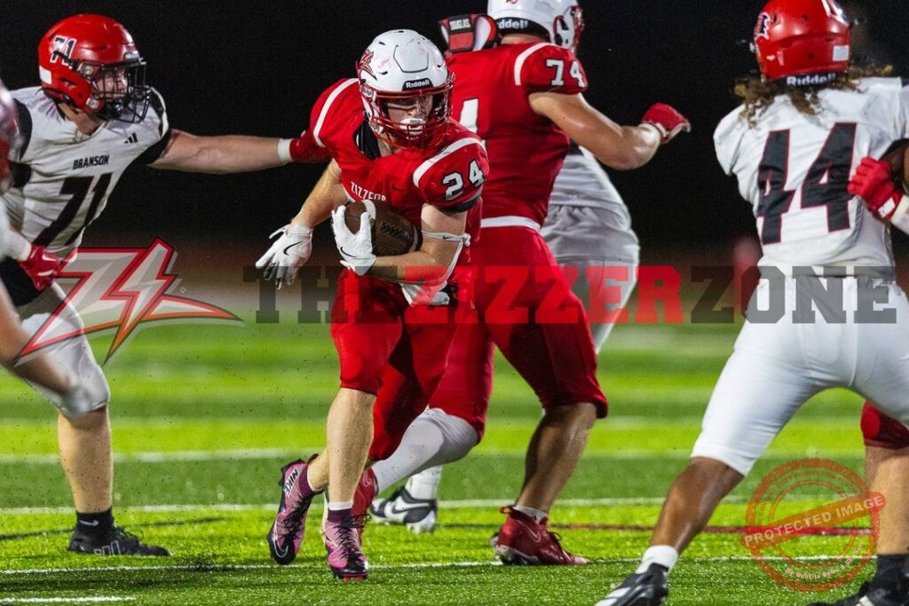 1st qtr #Zizzers host Branson at Homecoming. Maupin gets the kickoff return to the 14. Miller has to scramble, falls on the 8. Miller pitches to Taylor for 1. Miller goes long to Hale complete to the 46. Miller to Due complete at the 37. Taylor gets the ball, stripped, Branson recovers it on the 34. Moore tackles for the stop on the 41. Encroachment Zizzers. Branson gets stopped by Moore, first down on the 46. Encroachment Zizzers. QB keeper on the bad snap, Allen tackles. QB keeper, Long tackles. Judd stops the run. Branson gets 8 Hutsler tackles. QB keeper Lawson tackles with help from Marshall. Allen tackles on the carry. Hunter makes the stop. QB keeper first down Marshall tackles. 1st and goal on the 9. QB keeper to the 2, Hutsler tackles. Branson gets the TD. Extra point is good. 0-7, 3:04. Maupin receives the kickoff return to the 18. Taylor gets 3. Miller to Taylor complete for the first down on the 31. Miller to Due complete to the 35. Miller to Taylor for 3. Timeout Zizzers. Miller to Moore complete for the first down on the 48! Miller keeps for 5. End of the quarter.