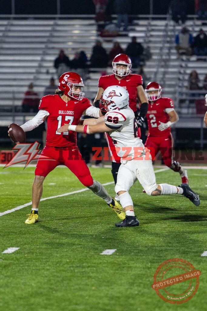 Wilson tackles on the kickoff return at the 30. Marshall tackles on the 5 yard run. Marshall and Long tackle on the run, first down on the 47. Freeman tackles on the QB keeper for 7. Fumble. CJ recovers for a loss of 3. Ball on the 50. Pass complete for a loss as Zizzer D makes the stop. Punt to the 9. Moore carries for 3. Taylor gets 3. Miller keeps for the first down on the 20. Miller scrambles throws away. Fumble, Miller dives to recover on the 4. Miller keeps but gets stopped. Cropper punts, Hutsler tackles on the Zizzers 28. Allen tackles with Warren on the 22. Freeman tackles for a loss with Moore on the 25. Bulldogs zig zag to the end zone. Extra point is good. 0-7, 4:14 left.