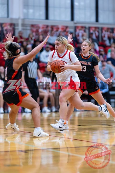 3rd qtr #LadyZizzers lead Republic 28-26. Green sinks a three! 31-26, 7:26. Scharnhorst rebounds sends it to Green who lays it up! 33-26. Tigers get 2 f/ts. Tigers for 2. Green sinks a three! Hafer scores and gets the foul! Hafer gets the f/t! 39-30. Tigers get 2 f/ts. Shrubb sinks a three! 42-32. Tigers drive – offensive foul! Green at the line: sinks 1. 43-32. Timeout 1:57. Tigers for 2. Green at the line: sinks 2! 45-34. Tigers for 3. 45-37. End of the qtr.